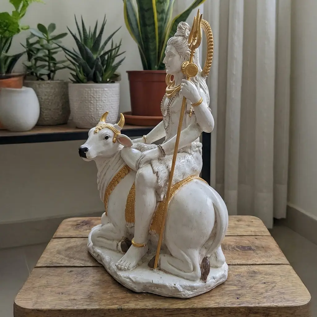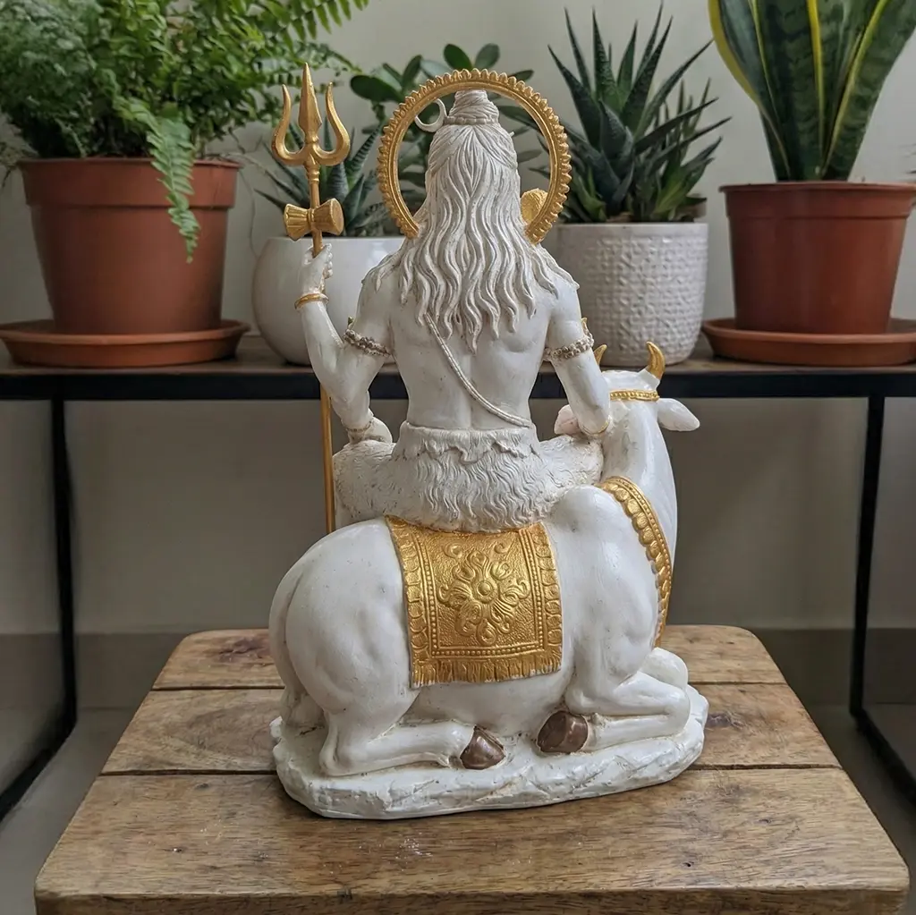 Crafted from high-quality resin, this white shiva showpiece boasts an immaculate marble-like finish. From the intricate golden trishul and the serpent around his neck to the calm expression on Nandi, every detail is meticulously hand-painted. It gives you the luxurious, handcrafted feel of a traditional shankar bhagwan murti, combined with lightweight durability perfect for modern shelving and tables.